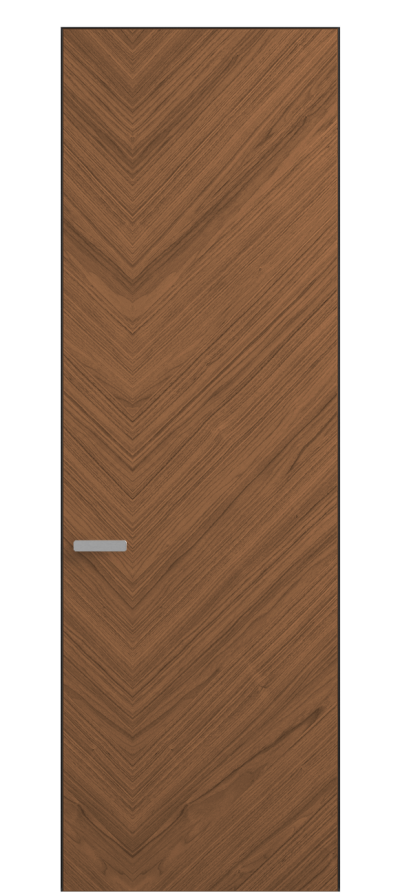 Полотно Rift в скрытом алюминиевом коробе становится полноценным элементом декора. В коллекции представлено 9 моделей дверей в высоте до 3 метров. Рисунок раскладки шпона варьируется от простого до сложного. «Рубашка» для каждого полотна подбирается вручную по цвету, текстуре и фактуре.