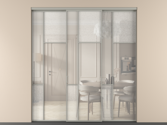 Во всех алюминиевых перегородках, независимо от типа установки, используется компланарный раздвижной механизм, благодаря которому декоративная крышка и полотно находятся в одной плоскости.