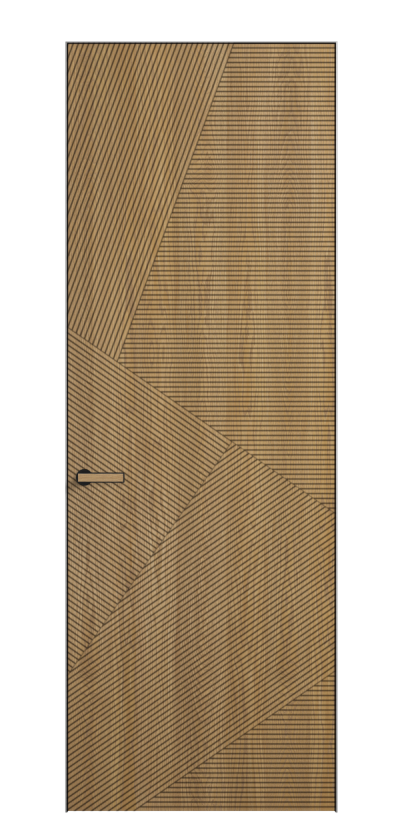 Это полотна с рельефной фрезеровкой. Этот прием делает интерьер объемным, тактильным, вносит интересную текстуру и создает современный образ. Волнистый рельеф может быть выполнен по ламелям из массива дуба в древесных матовых отделках, либо исполнен по натуральному и экологически безопасному материалу — ХДФ, покрытому гладкой эмалью актуальных оттенков.